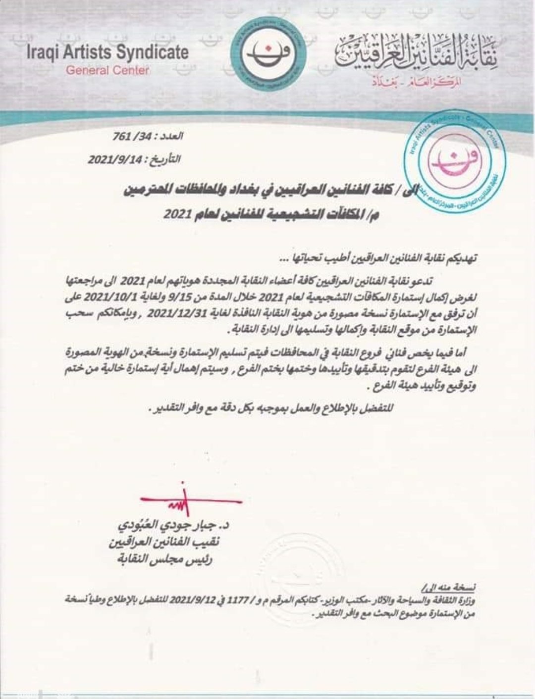 نشرت نقابة الفنانين العراقيين، اليوم الثلاثاء، ضوابط التقديم على المكافأه التشجيعية السنوية للفنانين لـ2021.