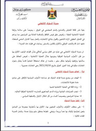 تنشر “العهد نيوز” نص مشروع مدونة السلوك الانتخابي الذي أعلن رئيس الجمهورية توقيعه بحضور رئيس الوزراء مصطفى الكاظمي وقادة الكتل.