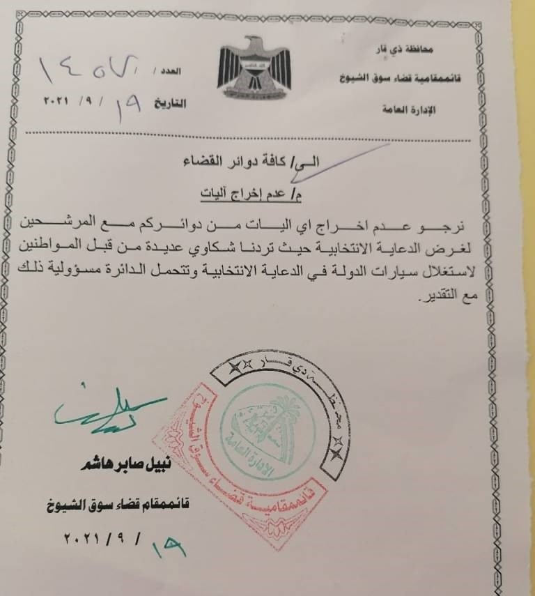 اصدرت قائممقامية سوق الشيوخ، اليوم الاثنين، توجيها بمنع خروج الياتها مع مرشحي الانتخابات لمنع عملية الترويج الانتخابي واستغلال المال العام.