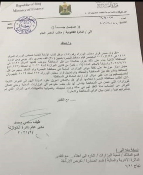 خاطبت  مدير عام دائرة الموازنة، في وزارة المالية، طيف سامي، بحسب وثيقة حصل عليها صحفي،  الدائرة القانونية بتحويل 30 الف درجة وظيفية الى عقود وزارية