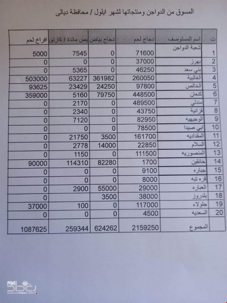 حصلت وكالة على وثيقة رسمية صادرة عن المستشفى البيطري في ديالى تظهر بالارقام حجم ما جرى تسويقه من منتوجات الدواجن خلال شهر ايلول الجاري، كاشفة عن تسويق اكثر من مليوني ومئة الف دجاجة لحم واكثر من 620 الف دجاجة لحم ونحو 260 الف كارتون بيض واكثر من مليون من افراخ اللحم.وقال احد منتجي الدواجن في ديالى يوسف الزيدي في حديث لصحفي،ان "3 اسباب دفعت لانتعاش تسويق منتوجات الدواجن في ديالى خلال 2021 بمعدلات ربما هي الاعلى بعد 2003 ابرزها احتواء الامراض الفتاكة من قبل المستشفى البيطري وسرعة التفاعل مع اي حالة بالاضافة الى زيادة خبرة اصحاب الحقول واعتمادهم اطر السلامة لمنع وصول الامراض".واضاف الزيدي،ان" قطاع الدواجن في ديالى يوفر فرص عمل تصل الى 5 الاف وربما اكثر وهي تحقق الاكتفاء في المحافظة ويصدر اكثر من 60% من الانتاج الى اسواق 8 محافظات عراقية ومنها بغداد".![]()