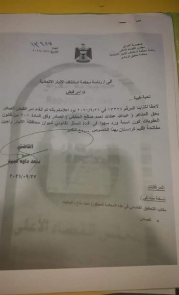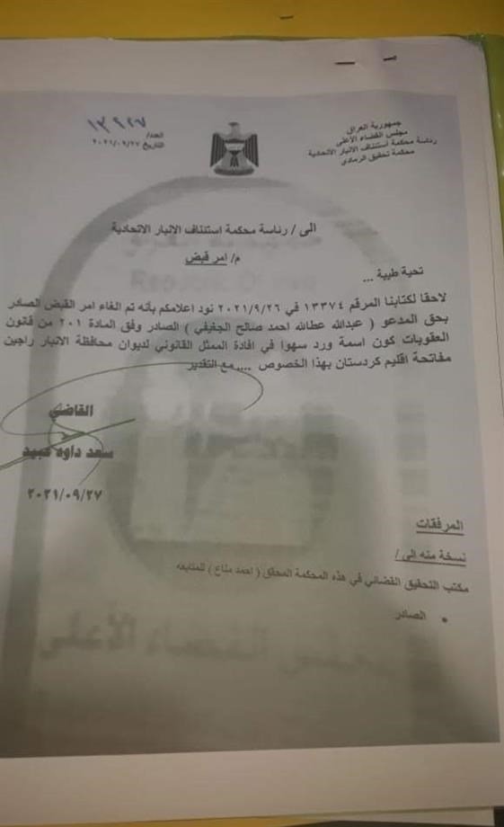 اظهرت وثيقة حصل عليها مصدر صحفي إلغاء أمر القبض بحق مرشح ائتلاف النصر عن محافظة الانبار، عبد الله عطاالله أحمد صالح الجغيفي، والذي ظهر اسمه سهواً في قائمة الحاضرين بمؤتمر السلام والاسترداد، الذي أقيم في اربيل للدعوة للتطبيع مع إسرائيل.