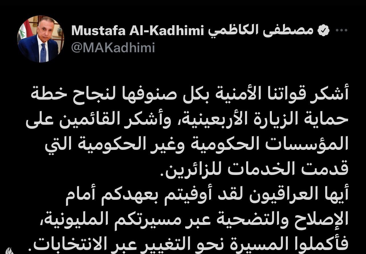 وقال الكاظمي في تغريدة عبر تويتر : "أشكر قواتنا الأمنية بكل صنوفها لنجاح خطة حماية الزيارة الأربعينية، وأشكر القائمين على المؤسسات الحكومية وغير الحكومية التي قدمت الخدمات للزائرين".وخاطب الكاظمي العراقيين بالقول: "لقد أوفيتم بعهدكم أمام الإصلاح والتضحية عبر مسيرتكم المليونية، فأكملوا المسيرة نحو التغيير عبر الانتخابات".