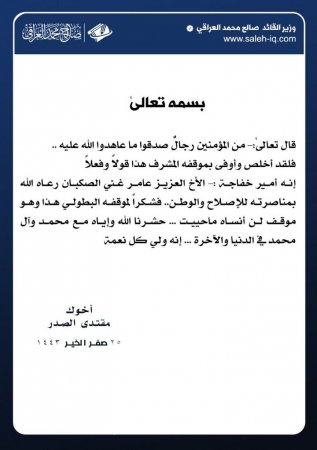 وقال الصدر، في بيان مقتضب نشره مكتبه الإعلامي، واطلع عليه صحفي، إن "أمير عشيرة خفاجة عامر غني الصكبان، أخلص وأوفى بموقفه المشرف قولا وفعلا، بمناصرته للإصلاح والوطن".