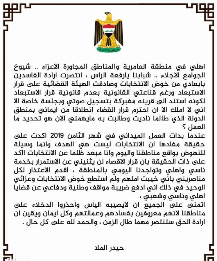 وقال الملا، في بيان له، إن "ارادة الفاسدين بابعادي من خوض الانتخابات انتصرت وصادقت الهيئة القضائية على قرار الاستبعاد ورغم قناعتي القانونية بعدم قانونية قرار الاستبعاد لكونه استند الى قرينة مفبركة بتسجيل صوتي وبجلسة خاصة إلا اني لا املك إلا ان احترم قرار القضاء انطلاقا من ايماني بمنطق الدولة الذي طالما ناديت وطالبت به، وما يهمني الآن هو تحديد ما العمل".