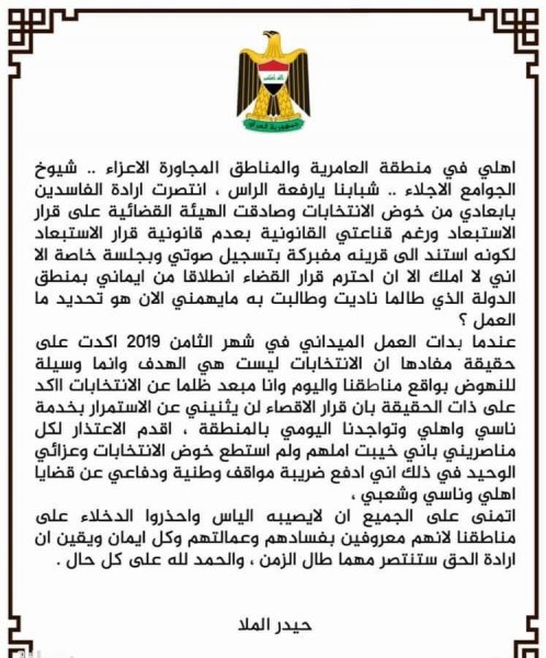 وأدناه تفاصيل حديث المرشح المستبعد حيدر الملا:-![]()