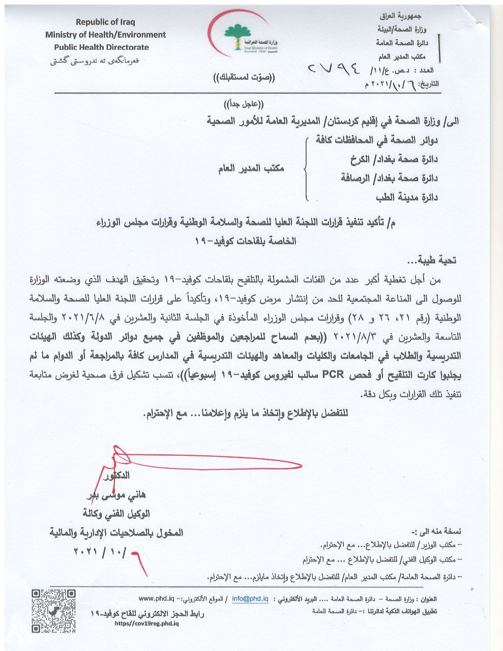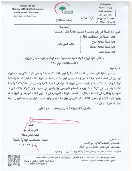 وجاء في كتاب وزارة الصحة انه "من أجل تغطية أكبر عدد من الفئات المشمولة بالتلقيح بلقاحات كوفيد-۱۹ وتحقيق الهدف الذي وضعته الوزارة للوصول إلى المناعة المجتمعية للحد من إنتشار مرض کوفید-۱۹، وتأكيدا على قرارات اللجنة العليا للصحة والسلامة الوطنية (رقم ۲۱، ۲۹ و ۲۸) وقرارات مجلس الوزراء المأخوذة في الجلسة الثانية والعشرين في ۲۰۲۱/۹/۸ والجلسة التاسعة والعشرين في ۲۰۲۱/۸/۳ (بعدم السماح للمراجعين والموظفين في جميع دوائر الدولة وكذلك الهيئات التدريسية والطلاب في الجامعات والكليات والمعاهد والهيئات التدريسية في المدارس كافة بالمراجعة أو الدوام ما لم يجلبوا كارت التلقيح أو فحص PCR سالب لفيروس كوفيد-19 إسبوعية)، تنسب تشكيل فرق صحية لغرض متابعة تنفيذ تلك القرارات وبكل دقة".![]()