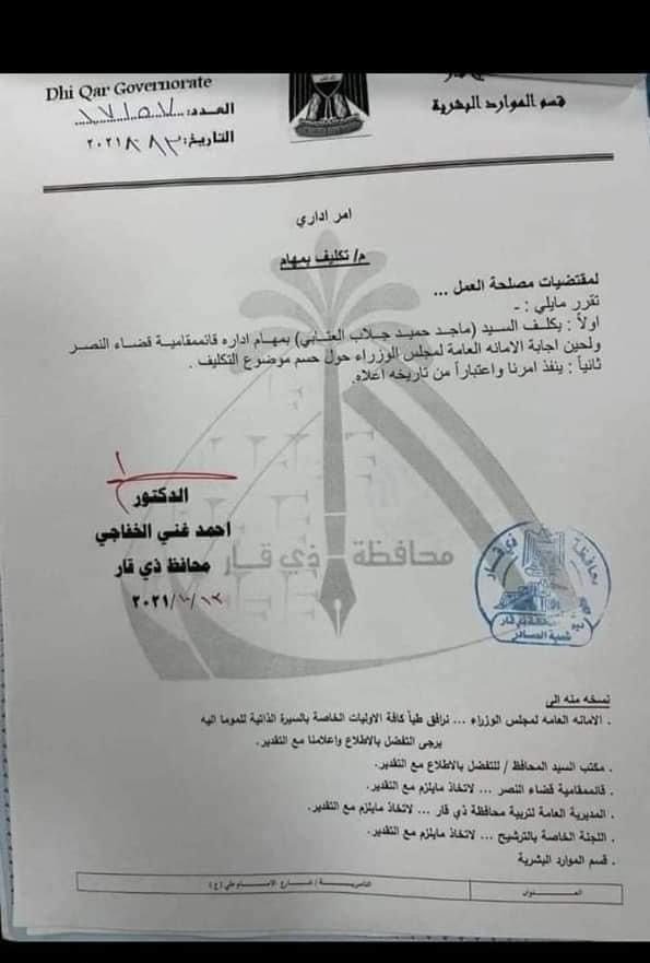 كلف محافظ ذي قار احمد الخفاجي، اليوم الاربعاء، قائممقام جديد لقضاء النصر.