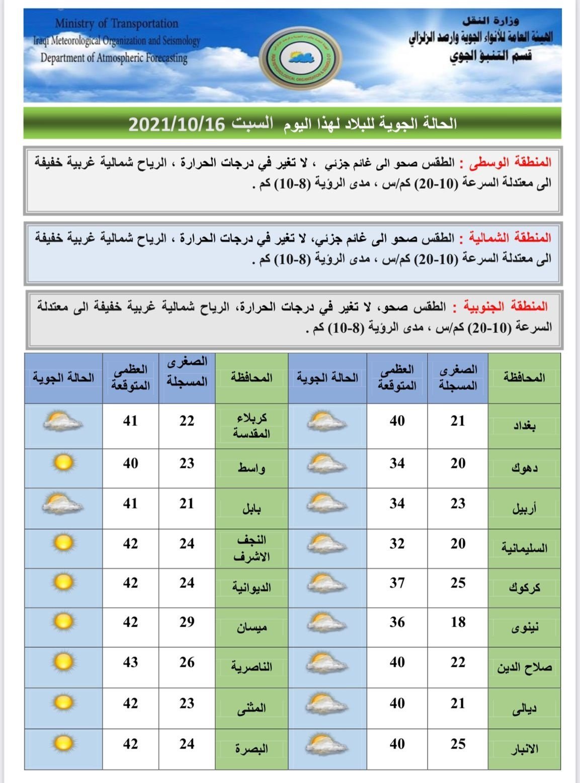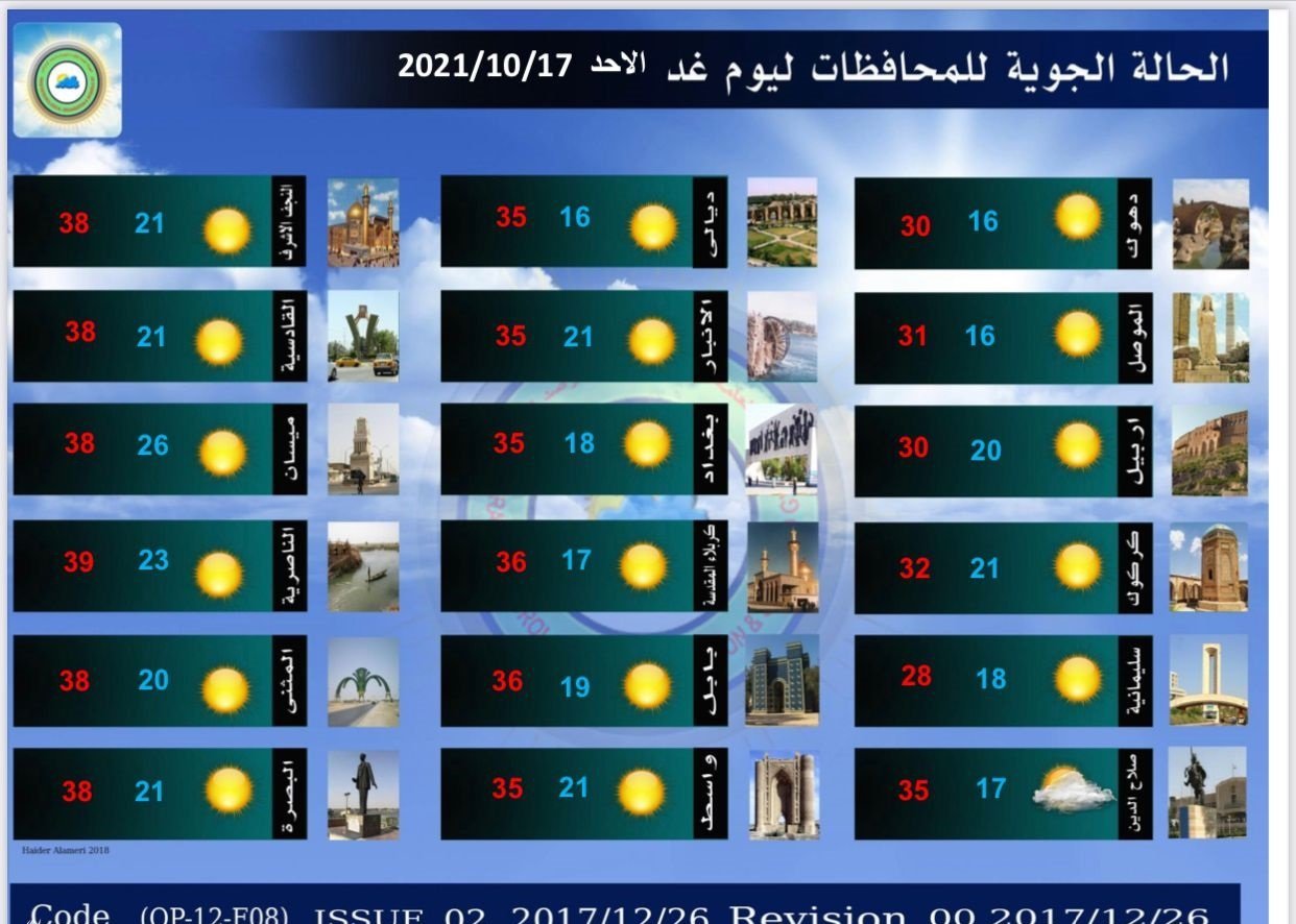 أعلنت هيئة الأنواء الجوية، اليوم السبت، حالة الطقس في البلاد للأيام المقبلة، فيما توقعت أن تكون درجات الحرارة دون الـ 40 مئوية في عموم العراق.