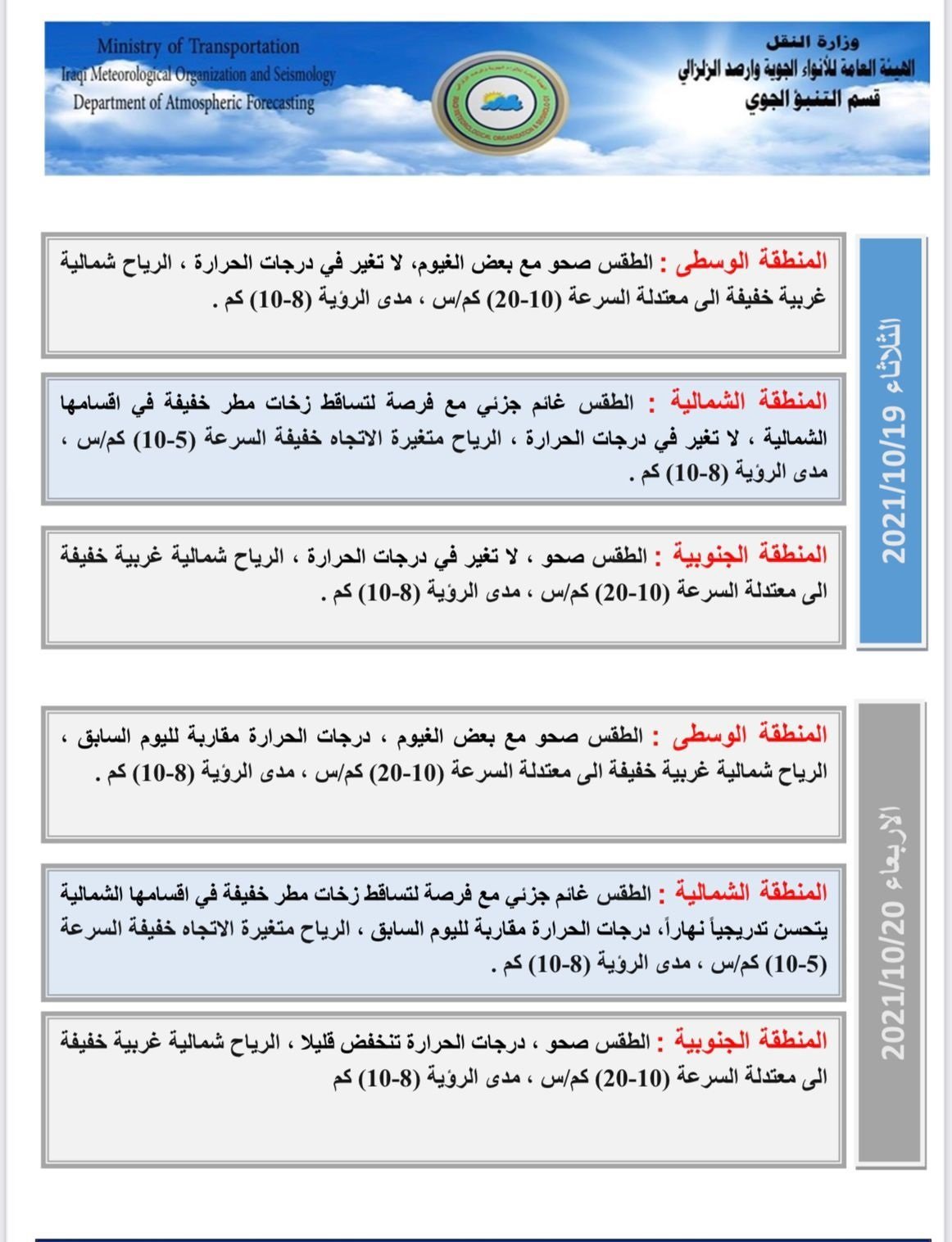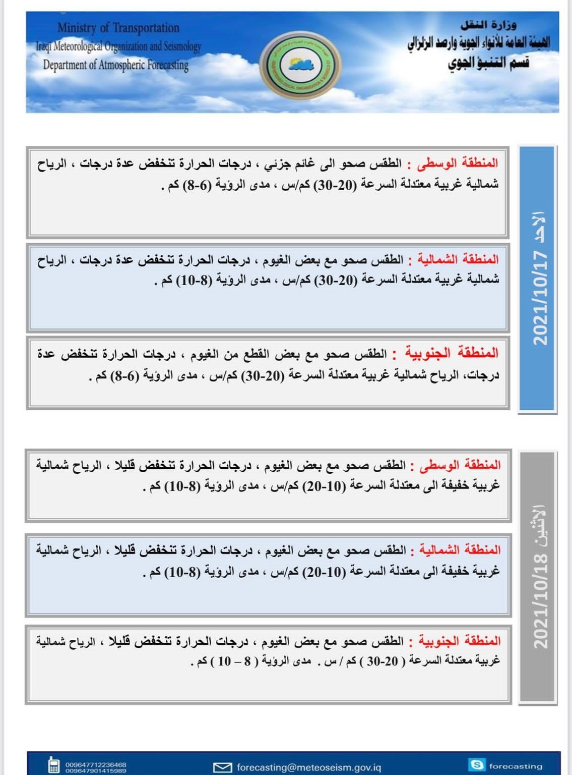 وأضاف البيان أن "طقس يوم الاثنين سيكون صحواً مع بعض الغيوم، ودرجات الحرارة تنخفض قليلاً في جميع مناطق البلاد".