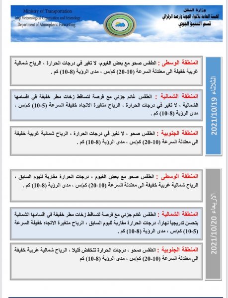 ولفت إلى أن "طقس يوم الأربعاء سيكون صحواً مع بعض الغيوم في المناطق الوسطى، أما الطقس في المناطق الشمالية فسيكون غائماً جزئياً مع فرصة لتساقط زخات مطر خفيفة في أقسامها الشمالية يتحسن تدريجياً نهاراً، أما الطقس في المنطقة الجنوبية فسيكون صحواً، أما درجات الحرارة فستكون مقاربة لليوم السابق في الأقسام الشمالية والوسطى من البلاد، بينما ستنخفض درجات الحرارة قليلاً في القسم الجنوبي".![]()