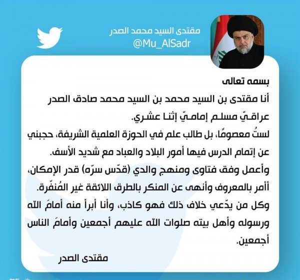 حدد زعيم التيار الصدري السيد مقتدى الصدر، اليوم الاحد، أسباب عدم اتمامه الدراسة في الحوزة العلمية.نص التغريدة ادناه: