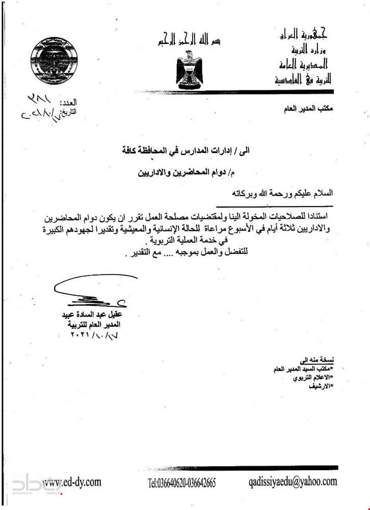 حددت مديرية تربية الديوانية، اليوم الأحد، الدوام بالنسبة للمحاضرين والإداريين في المدارس التابعة لها.وقال إعلام المديرية عبر وثيقة ، انه "استنادا للصلاحيات المخولة إلينا ولمقتضيات العمل تقرر أن يكون دوام المحاضرين والإداريين ثلاثة أيام في الاسبوع".