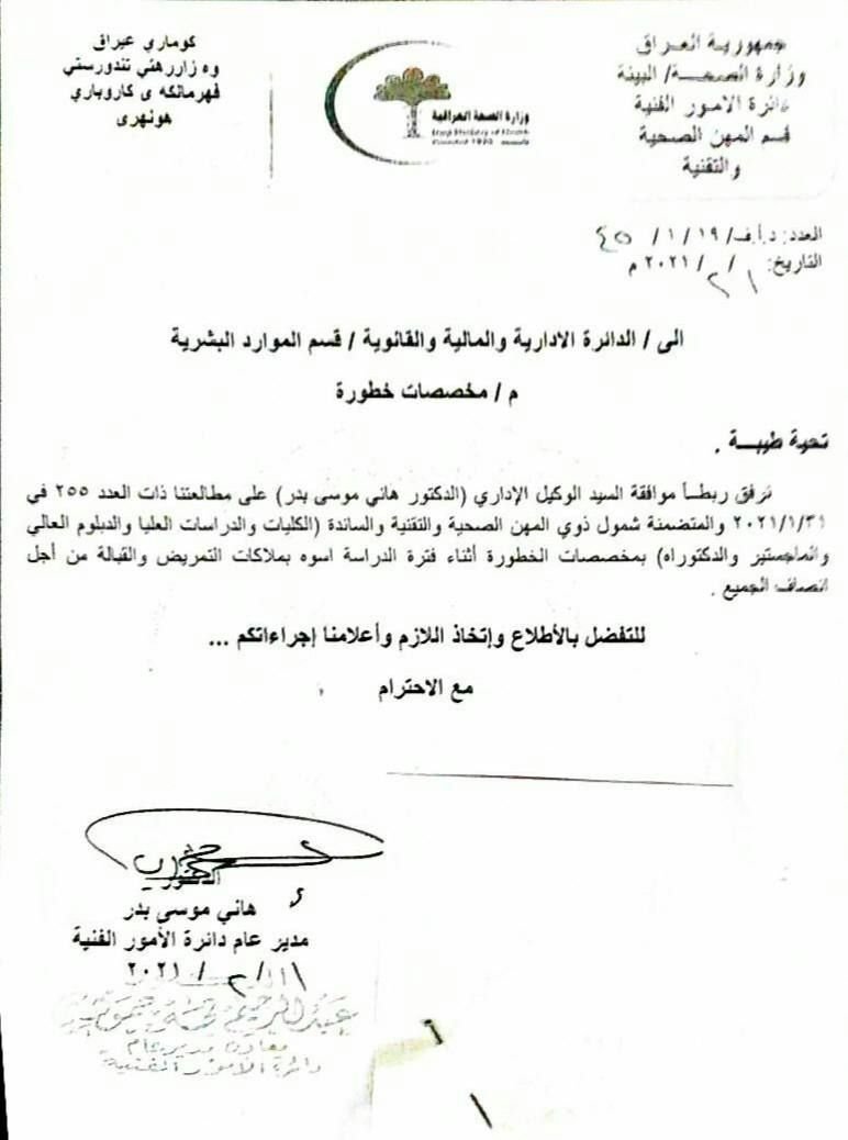 أصدر وزير العدل سالار عبدالستارمحمد، اليوم الاحد، توجيها يتعلق بمخصصات الخطورة ‏المهنية للممثلين القانونيين.وذكرت الوزارة في بيان لصحفي ، أن "وزير العدل، سالار عبدالستارمحمد، وجه بالاستمرار بصرف مخصصات الخطورة ‏المهنية للممثلين القانونيين لدائرتي الاصلاح العراقية ‏والاحداث".وبينت أن ذلك "استناداً الى توجيهات الامانة العامة ‏لمجلس الوزراء، بحضور مدير عام الدائرة الادارية ، هيثم محي راضي ومدير عام الدائرة القانونية، حنان منذر نصيف، ومدير مكتب الوزير، ‏زهراء عباس حمودي".‏وأكد الوزير، بحسب البيان، أن "الممثلين القانونيين لهم دور كبيرا ‏في تمثيل الوزارة من خلال العمل الدئوب الذي يقومون به ‏على اتم وجه".وأوضح أنه "يسعى دائما ان ينال كافة موظفي  ‏الوزارة لحقوقهم المشروعة لتعزيز العمل وتبسيط ‏الاجراءات بما يساهم في خدمة المصلحة العامة".