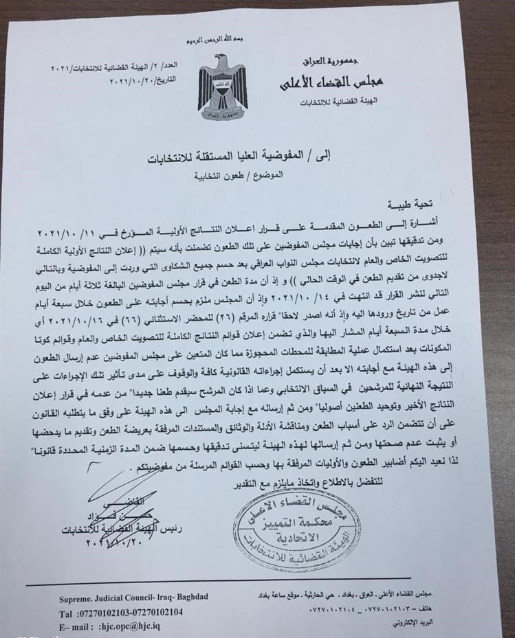 بالوثيقة .. القضاء يعيد طعون النتائج إلى مفوضية الانتخابات ويحدد الأسباب