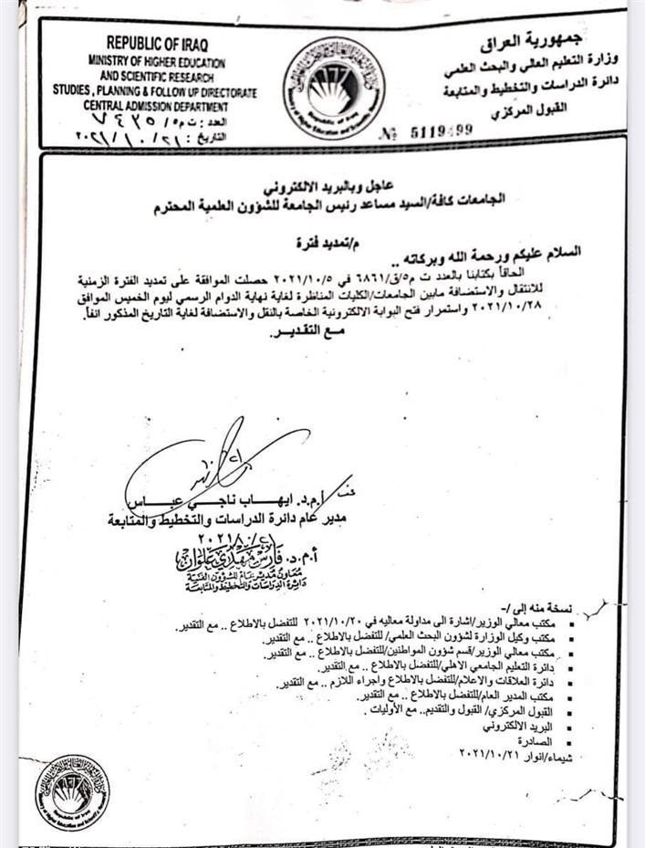 قررت وزارة التعليم العالي تمديد فترة النقل والاستضافة بين الجامعات والكليات الحكومية والاهلية الى 2021/10/28