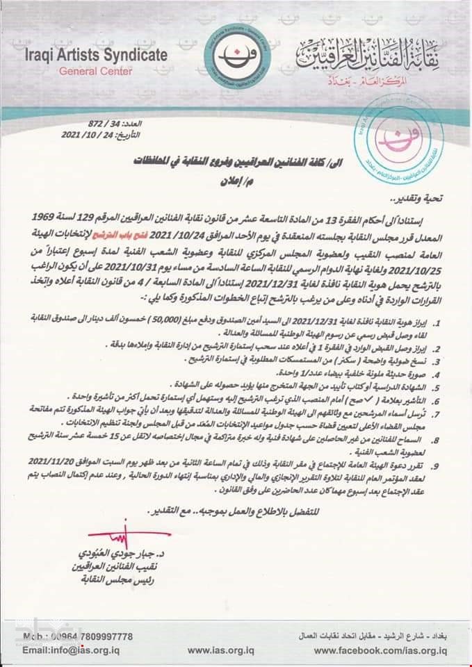 بالوثيقة.. نقابة الفنانين العراقيين تفتح باب الترشيح لانتخابات الهيئة العامة