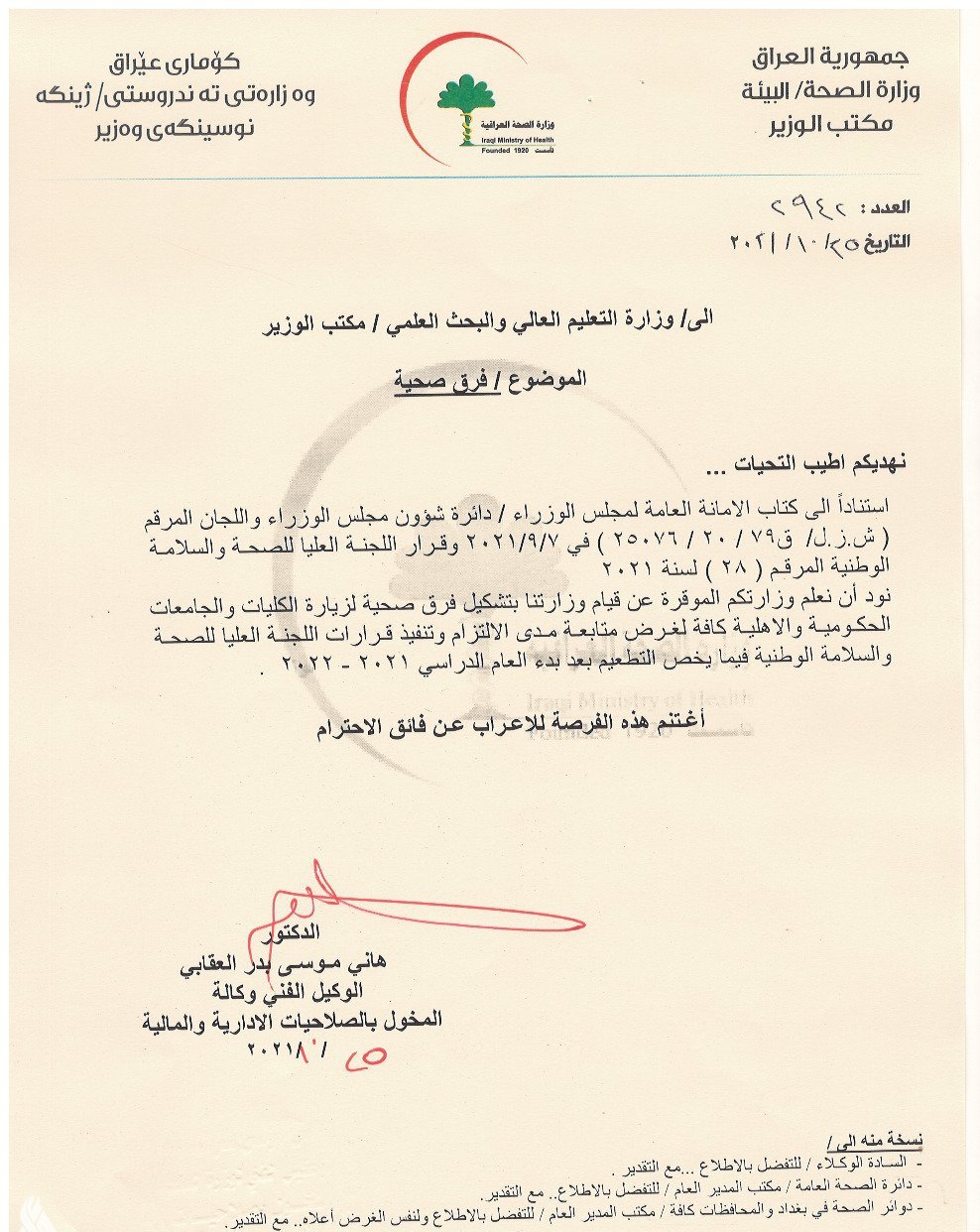 أعلنت وزارة الصحة، اليوم الاثنين، عن تشكيل فرقاً لمتابعة زيارة الكليات والجامعات الاهلية والحكومية.