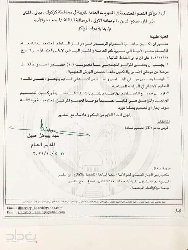 حددت وزارة التربية، اليوم الاثنين، موعد بدء دوام مراكز محو الأمية في محافظات العراق للعام 2021-2022.