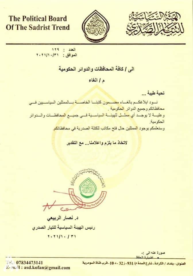 ووفقا لوثيقة صادرة من الهيئة السياسية للتيار الصدري حصلت عليها وكالة الأنباء العراقية : "نود إبلاغكم بإلغاء مضمون كتبنا الخاصة بالممثلين السياسيين في محافظاتكم وجميع الدوائر الحكومية، وعليه لا يوجد أي ممثل للهيئة السياسية في جميع المحافظات والدوائر الحكومية، وسنعلمكم بوجود الممثلين حال فتح مكاتب للكتلة الصدرية في محافظاتكم".