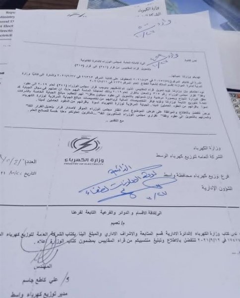 ودعت الوزارة في وثيقة لهاا، الأمانة العامة لمجلس الوزراء إلى تحويل قراء المقاييس في محافظة واسط الى عقود وذلك للحاجة الماسة إليهم.