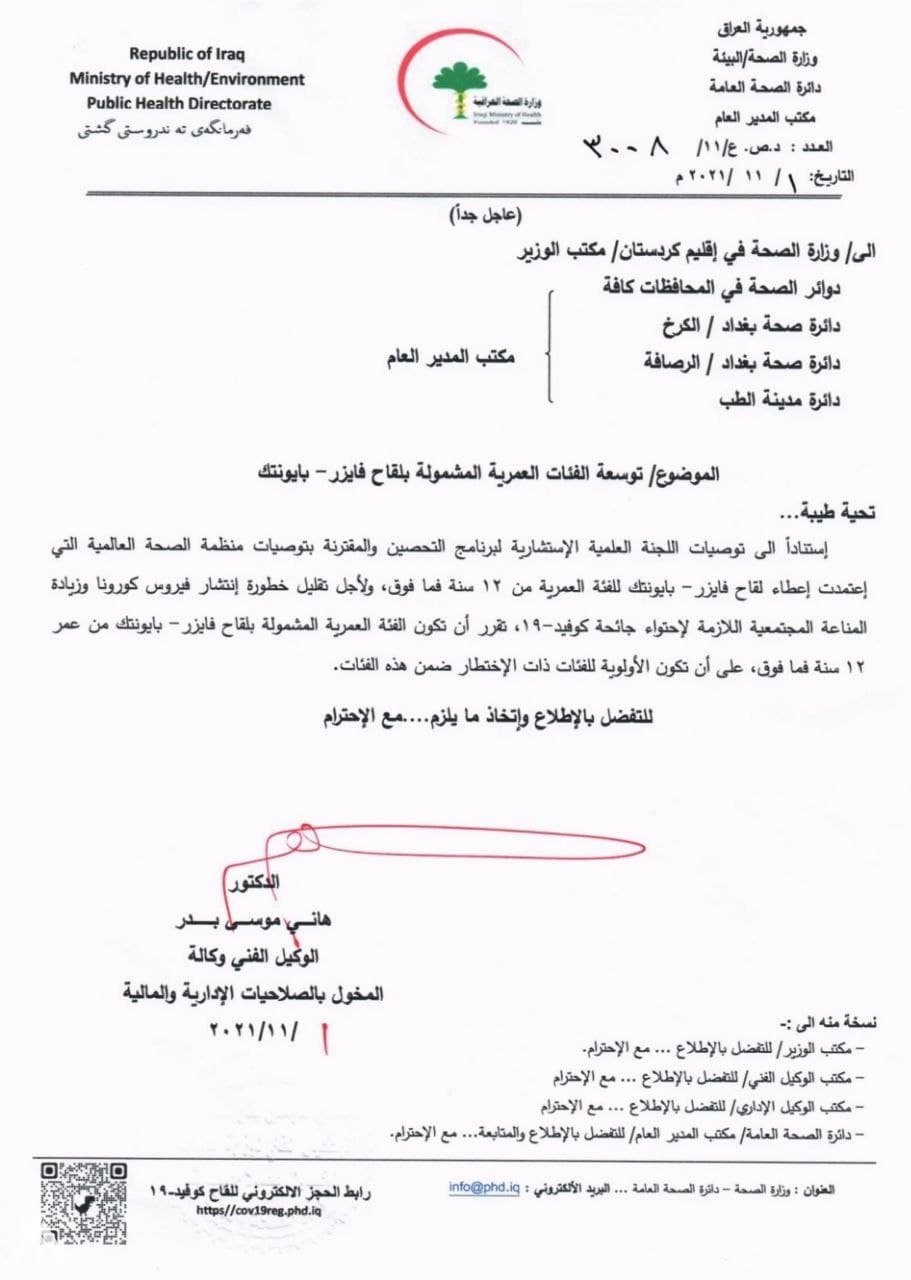 وذكرت الوزارة في بيان لها انه "استنادا إلى توصيات اللجنة العلمية الاستشارية لبرنامج التحصين والمقترنة بتوصيات منظمة الصحة العالمية التي إعتمدت إعطاء لقاح فايزر - بایونتك للفئة العمرية من 12 سنة فما فوق، ولأجل تقليل خطورة إنتشار فيروس كورونا وزيادة المناعة المجتمعية اللازمة لاحتواء جائحة كوفيد-19 تقرر أن تكون الفئة العمرية المشمولة بلقاح فايزر - بایونتك من عمر 12 سنة فما فوق".