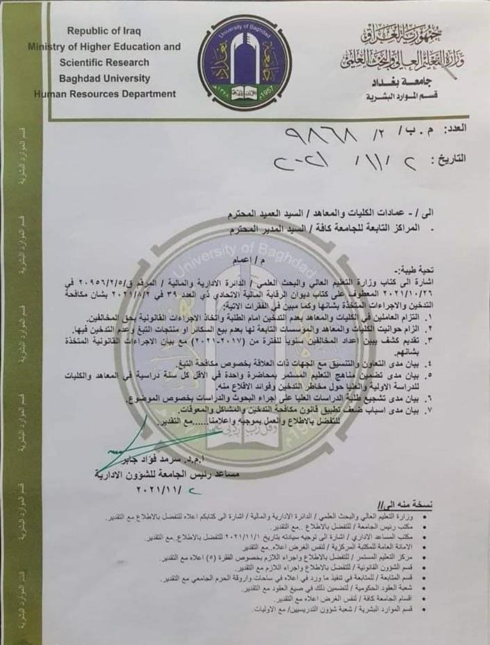 أصدرت رئاسة جامعة بغداد، أعمام بمنع التدخين وشرب الاركيلة الالكترونية في داخل الجامعة.وحصل مصدر صحفي، على الاعمام، الذي جاء فيه :