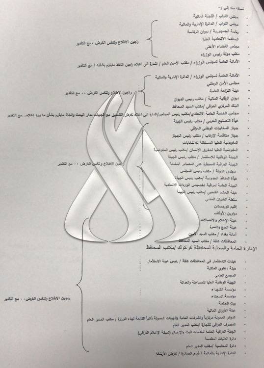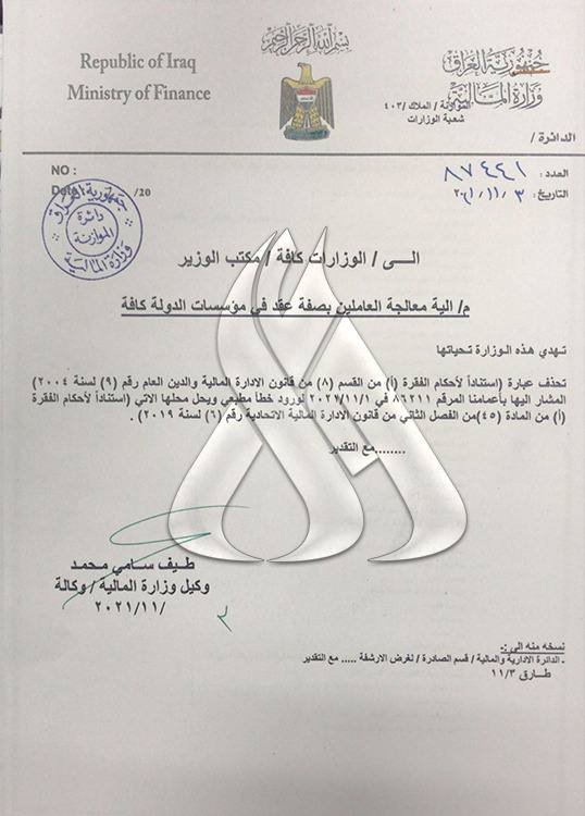 وتضمنت التعديلات بحسب كتاب صادر من وزارة المالية "حذف عبارة (استنادا لأحكام الفقرة (أ) من القسم (8) من قانون الإدارة المالية والدين العام رقم (1) لسنة 2004) المشار اليها بأعمامنا الصادر في الاول من تشرين الثاني الحالي، لورود خطأ مطبعي ويحل محلها الأتي (استنادا الأحكام الفقرة (أ) من المادة (45) من الفصل الثاني من قانون الادارة المالية الاتحادية رقم (1) لسنة 2019".
