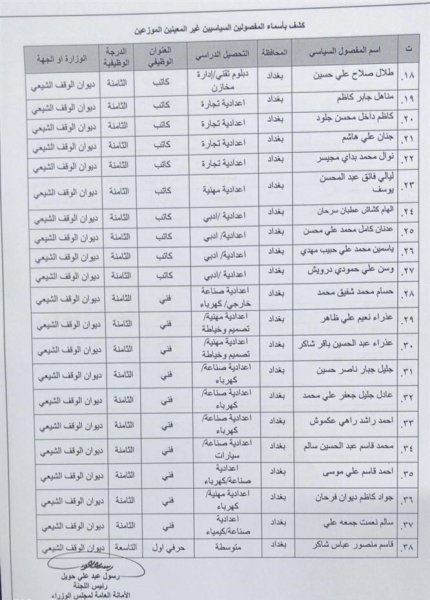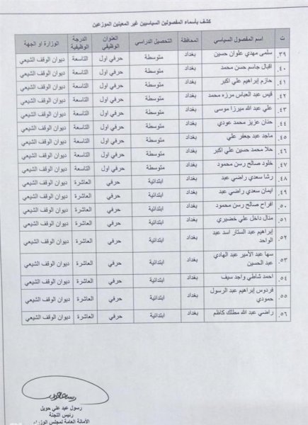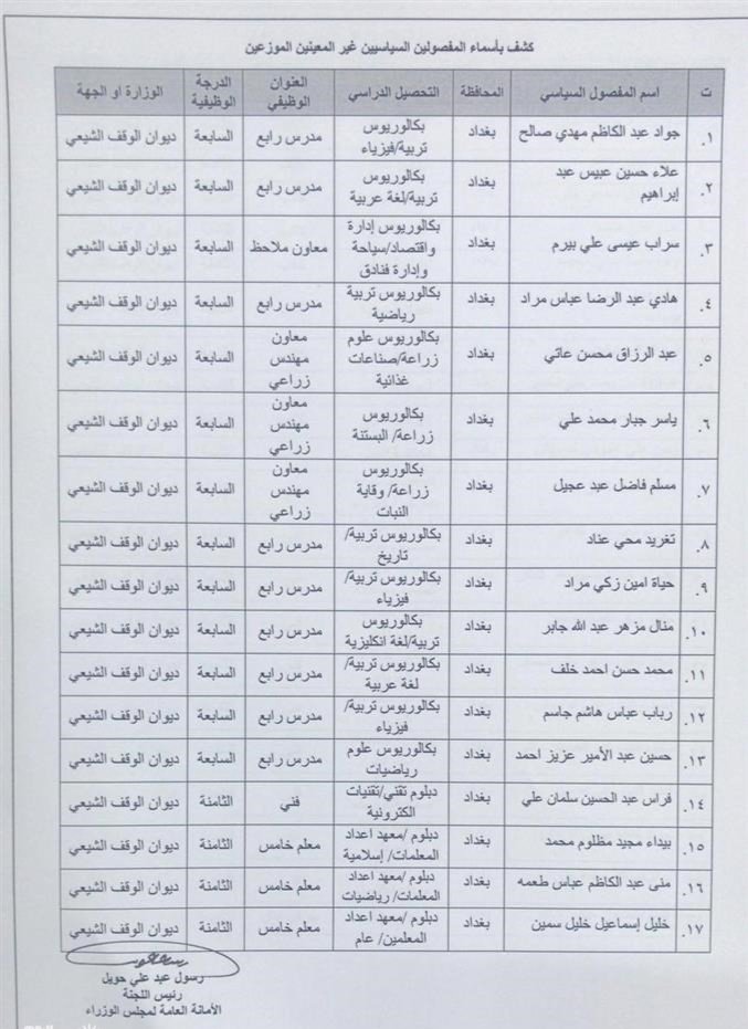 وقالت الأمانة العامة لمجلس الوزراء في بيان لها إن "دائرة شؤون المفصولين السياسيين، في الأمانة العامة لمجلس الوزراء أصدرت وجبة جديدة من المشمولين بأحكام قانون المفصولين السياسيين رقم (24 لسنة 2005) المعدل لغرض استكمال إجراءات تعيينهم في ديوان الوقف الشيعي".وأضاف أن "الدائرة أرسلت الأضابير الخاصة بالمشمولين، الذين صدرت لهم قرارات صحيحة من لجنة التحقق من المفصولين السياسيين، في الأمانة العامة لمجلس الوزراء".