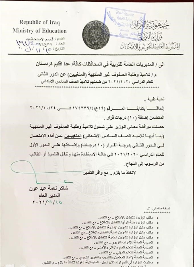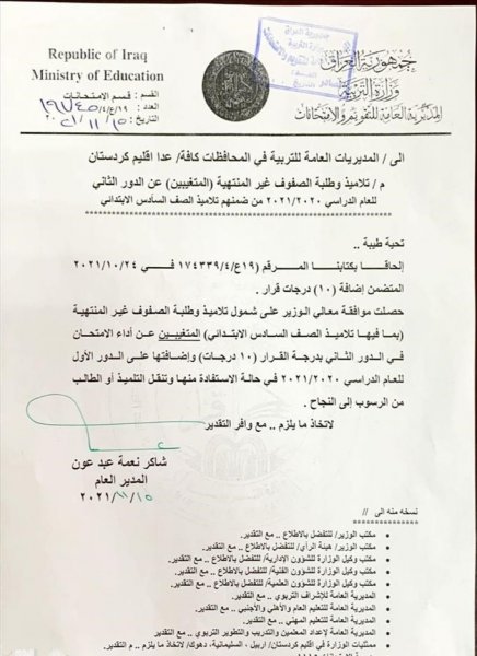 واضافت ان "وزير التربية علي حميد الدليمي وافق على شمول تلاميذ وطلبة الصفوف غير المنتهية (بما فيها تلاميذ الصف السادس الابتدائي) المتغيبين عن أداء الامتحان في الدور الثاني بدرجة القرار (10 درجات) ، واضافتها على الدور الأول للعام الدراسي 2020 – 2021 ، في حالة الاستفادة منها وتنقل التلميذ أو الطالب من الرسوب الى النجاح".![]()