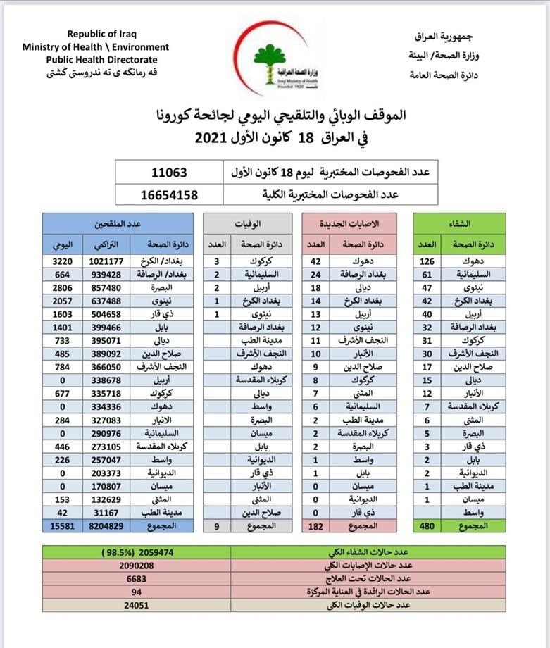 وذكرت الوزارة، في بيان لها أنها "سجلت 182 إصابة جديدة بفيروس كورونا، فيما تماثل 480 من الأشخاص للشفاء".وأضاف البيان أن "حالات الوفاة الجديدة بكورونا بلغت 9 حالات في عموم محافظات البلاد"، لافتا إلى أن "الاشخاص الذين تلقوا اللقاح خلال 24 ساعة بلغ عددهم 15581".![]()