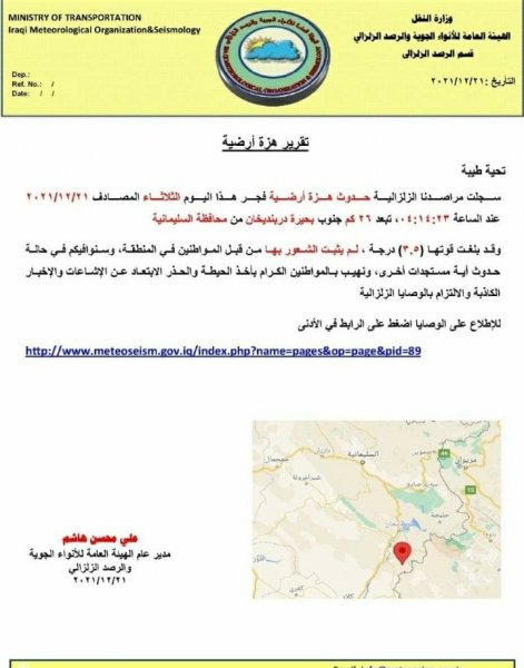 وأضافت أن "قوة الهزة بلغت (3،5) درجات حيث تبعد (26)كم جنوب بحيرة دربندخان"، مشيرة الى أنه "لم يثبت الشعور بها من قبل المواطنين في المنطقة".