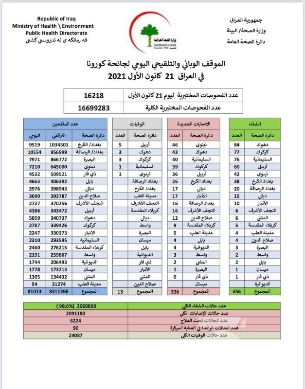 أعلنت وزارة الصحة، الثلاثاء (21 كانون الأول 2021)، تسجيل إصابة 336 جديدة بفيروس كورونا، 13 وفاة ناجمة عنه، مقابل 456 حالة تعافٍ، في عموم العراق، خلال الساعات الأربع والعشرين الماضية.