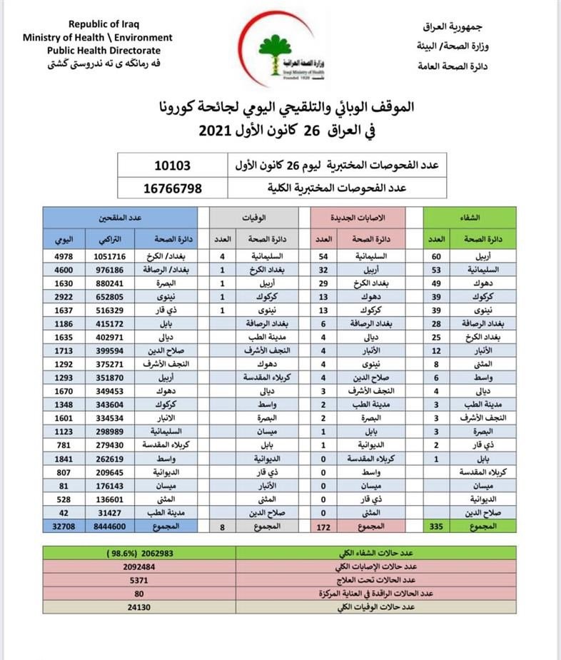 وذكرت الوزارة، في بيان لها أنها "سجلت 172 إصابة جديدة بفيروس كورونا، فيما تماثل 335 من الأشخاص للشفاء".وأضاف البيان أن "حالات الوفاة الجديدة بكورونا بلغت 8 حالات في عموم محافظات البلاد"، لافتا إلى أن "الاشخاص الذين تلقوا اللقاح خلال 24 ساعة بلغ عددهم 32708".![]()
