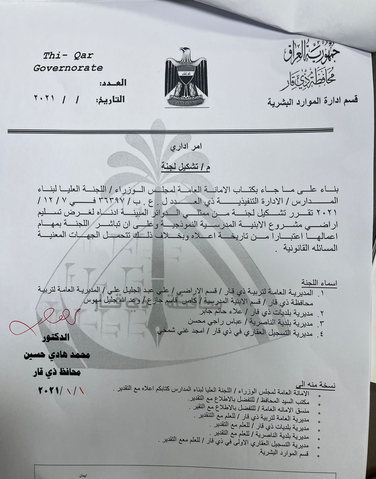 وقال محافظ ذي قار محمد هادي الغزي بحسب وثيقة صادرة عن مكتبه إنه "تقرر تشكيل لجنة من ممثلي دوائر مديرية التربية والبلديات والبلدية والتسجيل العقاري، للبدء بتسليم أراضي مشروع الأبنية المدرسية النموذجية".وشدد الغزي "على مباشرة اللجنة أعمالها خلال أيام لإنجاز تسليم أراضي الأبنية النموذجية"، مشيراً الى أن "المشروع يعد من المشاريع الاستراتيجية المهمة في المحافظة".