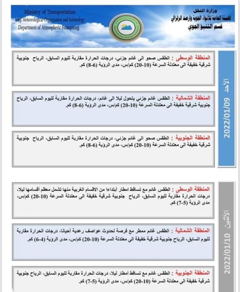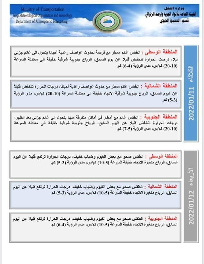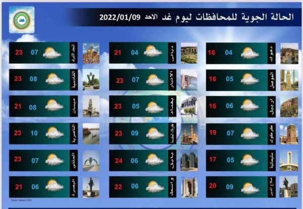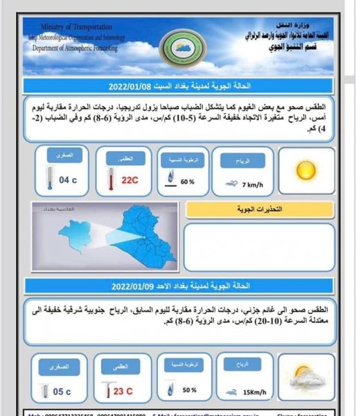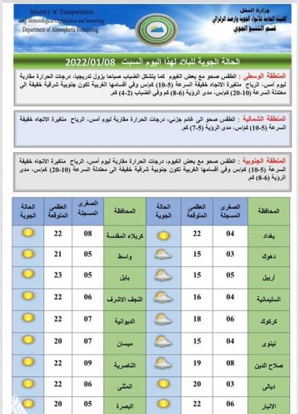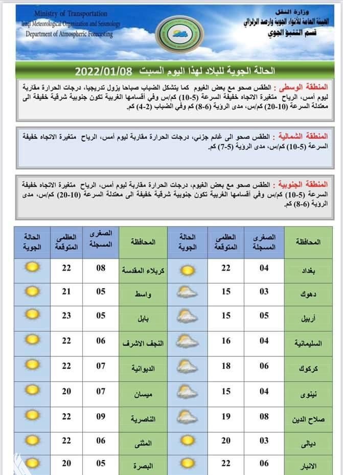 وذكر بيان للهيئة، أن "الحالة الجوية في البلاد خلال اليوم السبت سيكون في المنطقة الوسطى صحو مع بعض الغيوم كما يتشكل الضباب صباحاً يزول تدريجياً، وفي المنطقة الشمالية سيكون الطقس غائم جزئيأ، وفي المنطقة الجنوبية سيكون الطقس صحو مع بعض الغيوم، فيما ستكون درجات الحرارة مقاربة لليوم السابق في جميع انحاء البلاد، حيث ستكون درجات الحرارة العظمى في بغداد 22 ودهوك وأربيل ونينوى 15، الانبار وكربلاء المقدسة والنجف الاشرف والديوانية والناصرية والمثنى 22، البصرة 20 ".