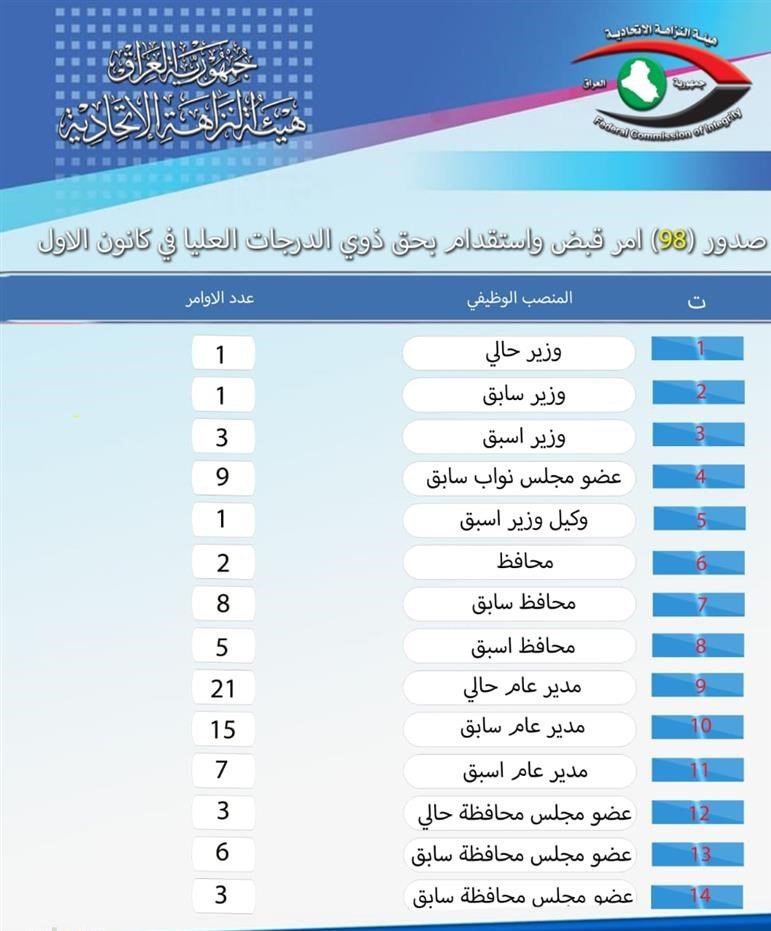 وقال بيان للنزاهة ان "دائرة التحقيقات في الهيئة أفادت بأنَّ أوامر القبض والاستقدام التي أصدرتها الجهات القضائيَّة جاءت على خلفيَّة قضايا حقَّقت فيها مُديريَّات ومكاتب تحقيق الهيئة في بغداد والمحافظات وأحالتها إلى القضاء".وأوضح البيان، ان "هناك (98) أمر قبضٍ واستقدامٍ بحقّ كبار المسؤولين من ذوي الدرجات العليا للمُّدة من (1-31/12/2021)، منها (21) أمر قبضٍ و(77) أمر استقدام".وأضاف، إنَّ "الأوامر شملت وزيراً حالياً ووزيراً سابقاً وثلاثة وزراء أسبقين ووكيلاً أسبق وتسعة نوَّاب سابقين، فضلاً عن مُحافظين حاليَّينِ و(8) محافظين سابقين و(5) أسبقين، كما شملت الأوامر (21) مديراً عاماً حالياً و(15) مديراً عاماً سابقاً وسبعة أسبقين، فيما صدرت (12) أمراً بحقِّ أعضاء مجالس محافظات".![]()