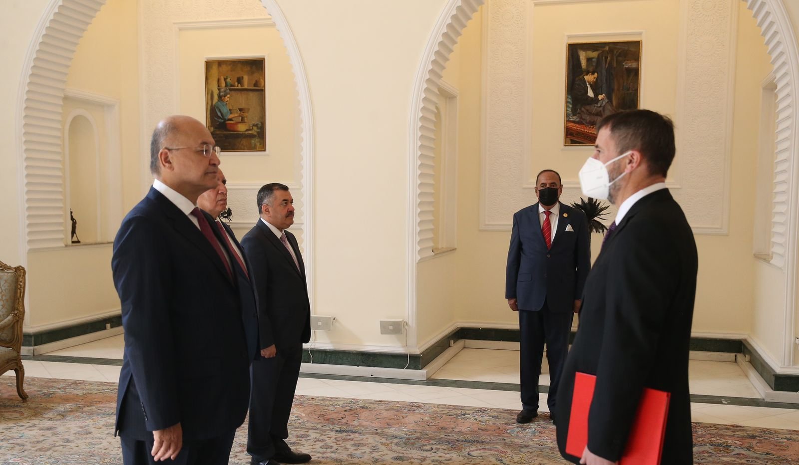 وقالت رئاسة الجمهورية في بيان لها، ان "رئيس الجمهورية برهم صالح تسلم، اليوم، في قصر السلام ببغداد، أوراق اعتماد سفراء كلٍّ من جمهورية كوريا الجنوبية تشوي سونغ سو، والجمهورية الجزائرية الديمقراطية الشعبية بلقاسم محمودي، وجمهورية النيبال الديمقراطية الاتحادية دورغا براساد، وجمهورية سلوفينيا بريموز سلكو، وجمهورية كازاخستان ايداربيك توماتوف، وجمهورية استوينا لمبيت ايبو، وجمهورية ايرلندا فينسنت اونيل، وجمهورية سلوفاكيا مارك فارغا، وجمهورية بوركينا فاسو الاسان مونيه، وجمهورية نيجيريا الاتحادية فاروق مالامي يابو، ومملكة النرويج اسبن ايفينت ليندبيك، وجمهورية قبرص ميخاليس ايوانو".