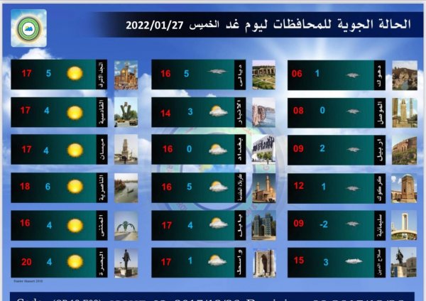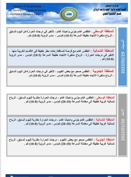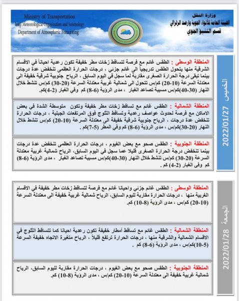 أعلنت هيئة الانواء الجوية، اليوم الأربعاء، عن حالة الطقس في البلاد للأيام المقبلة، فيما توقعت حدوث عواصف رعدية وانخفاضاً في درجات الحرارة غداً الخميس.