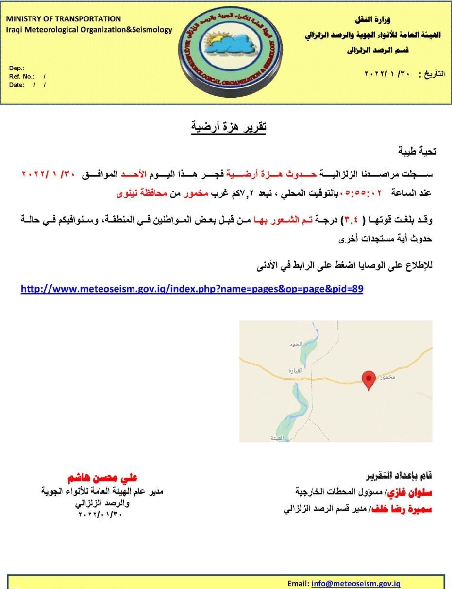وذكر بيان للوزارة ، أنَّ "المراصد الزلزالية في الهيئة العامة للأنواء الجويَّة والرصد الزلزالي، سجَّلت حدوث هزة أرضية فجر هذا اليوم الموافق في قضاء مخمور من محافظة نينوى".