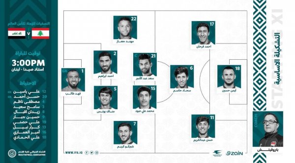 أعلن الاتحاد العراقي لكرة القدم، تشكيلة منتخبنا الوطنيّ لمواجهةِ نظيره اللبناني التي تقامُ اليوم الثلاثاء في ملعبِ صيدا في بيروت بالساعةِ الثالثة عصرًا.