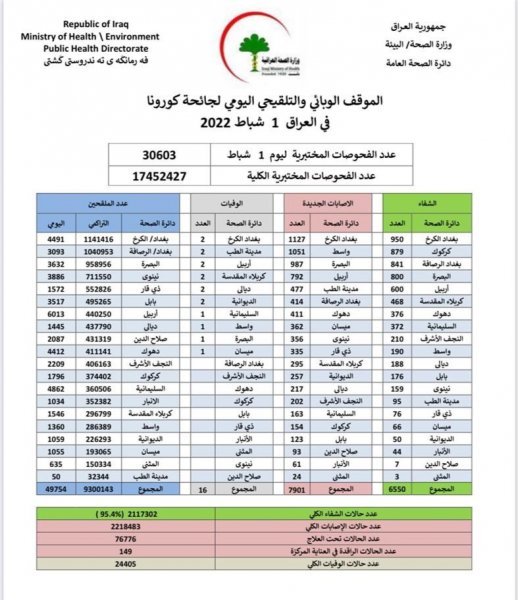 أعلنت وزارة الصحة، اليوم الثلاثاء، الموقف الوبائي اليومي لجائحة كورونا في عموم البلاد.