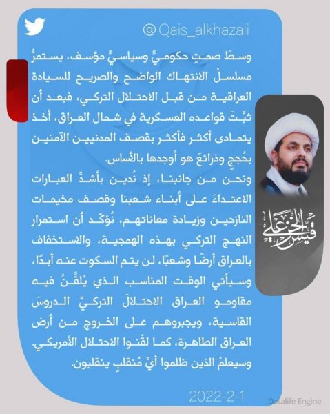 توعد الأمين العام لعصائب أهل الحق قيس الخزعلي، بـ"عدم السكوت" على استمرار القصف التركي داخل الأراضي العراقية. وجاء في تدوينة له، (2 شباط 2022)، "سيأتي الوقت المناسب الذي يلقن فيه مقاومو العراق الاحتلال التركي الدروس القاسية".