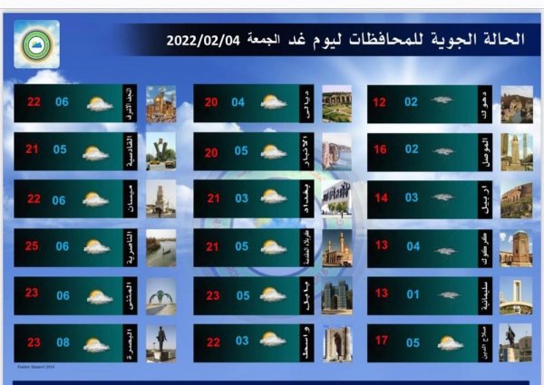 نشر مصدر صحفي الخميس، جدولاً يبين الحالة الجوية في عموم محافظات العراق ليوم غد الجمعة.تفاصيل الجدول في أدناه: