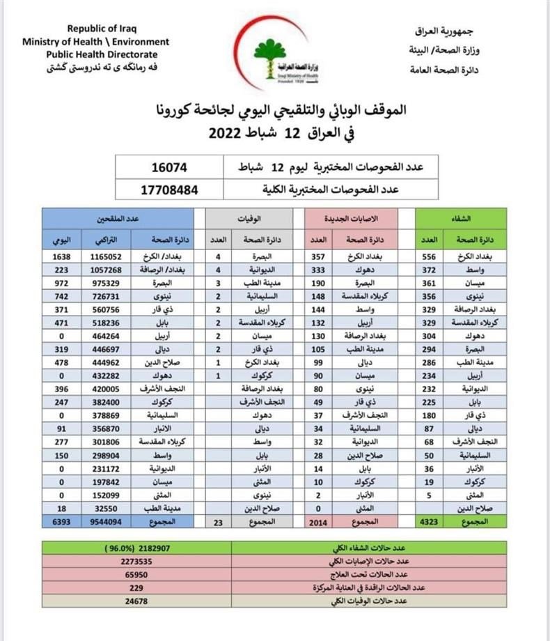وذكرت الوزارة، في بيان لها أنها "سجلت 2014 إصابة جديدة بفيروس كورونا، فيما تماثل 4323 من الأشخاص للشفاء".وأضاف البيان أن "حالات الوفاة الجديدة بكورونا بلغت 23 حالة في عموم محافظات البلاد"، لافتا إلى أن "الاشخاص الذين تلقوا اللقاح خلال 24 ساعة بلغ عددهم 6393".