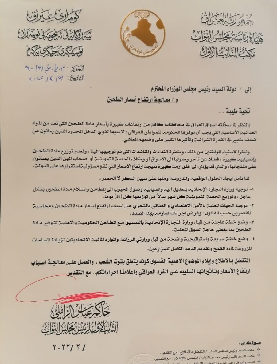 ودعا الزاملي في كتاب رسمي موجه للحكومة الى "وضع الحلول الواقعية والمدروسة لمعالجة اسباب ارتفاع الاسعار من خلال حث وزارة التجارة الاتحادية على تعديل آلية، وانسيابية وصول الحبوب الى المطاحن"، مشيراً الى "توزيع الحصة التموينية كل شهر بدلا من (45) يوم".وشدد الزاملي على "أهمية توجيه الجهات المعنية بالأمن الاقتصادي والغذائي بالتحري عن اسباب ارتفاع الاسعار ومحاسبة المتلاعبين والمقصرين"، مطالباً "وزارة التجارة بوضع خطة عاجلة بالتنسيق مع المطاحن الحكومية والاهلية لتوفير الطحين بما يغطي حاجة السوق المحلية، فضلا عن وضع رؤية استراتيجية من قبل وزارتي الزراعة والموارد المائية لزيادة المساحات المزروعة لمادة القمح وتقديم الدعم الكامل للمزارعين".