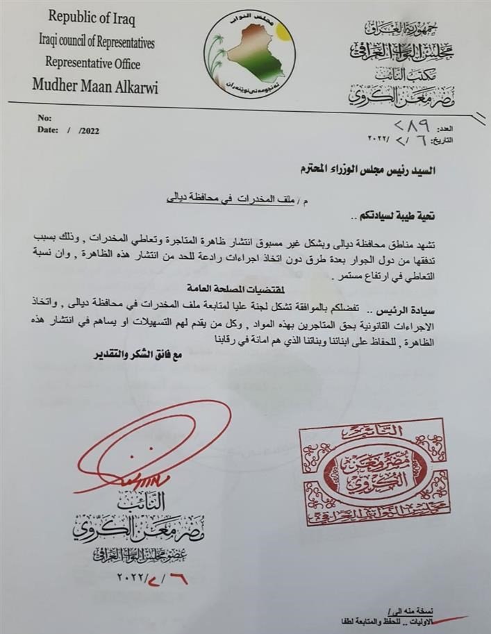 حصل مصدر صحفي، اليوم الاربعاء، على وثيقة صادرة عن النائب مضر الكروي تتضمن مطالبة رئيس مجلس الوزراء بتشكيل لجنة عليا لمتابعة ملف المخدرات في ديالى بعد انتشارها بشكل غير مسبوق واتخاذ الاجراءات القانونية بحق المتاجرين بها.