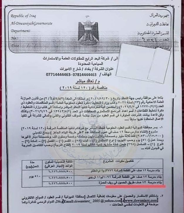 اظهرت وثيقة صادرة من قسم العقود الحكومية في الديوانية، خصص فيها ثلاثة مليارات و٤٥٠مليون كلفة بناء ثلاث مدارس في المحافظة.وجاء في الوثيقة ما هو نصه: