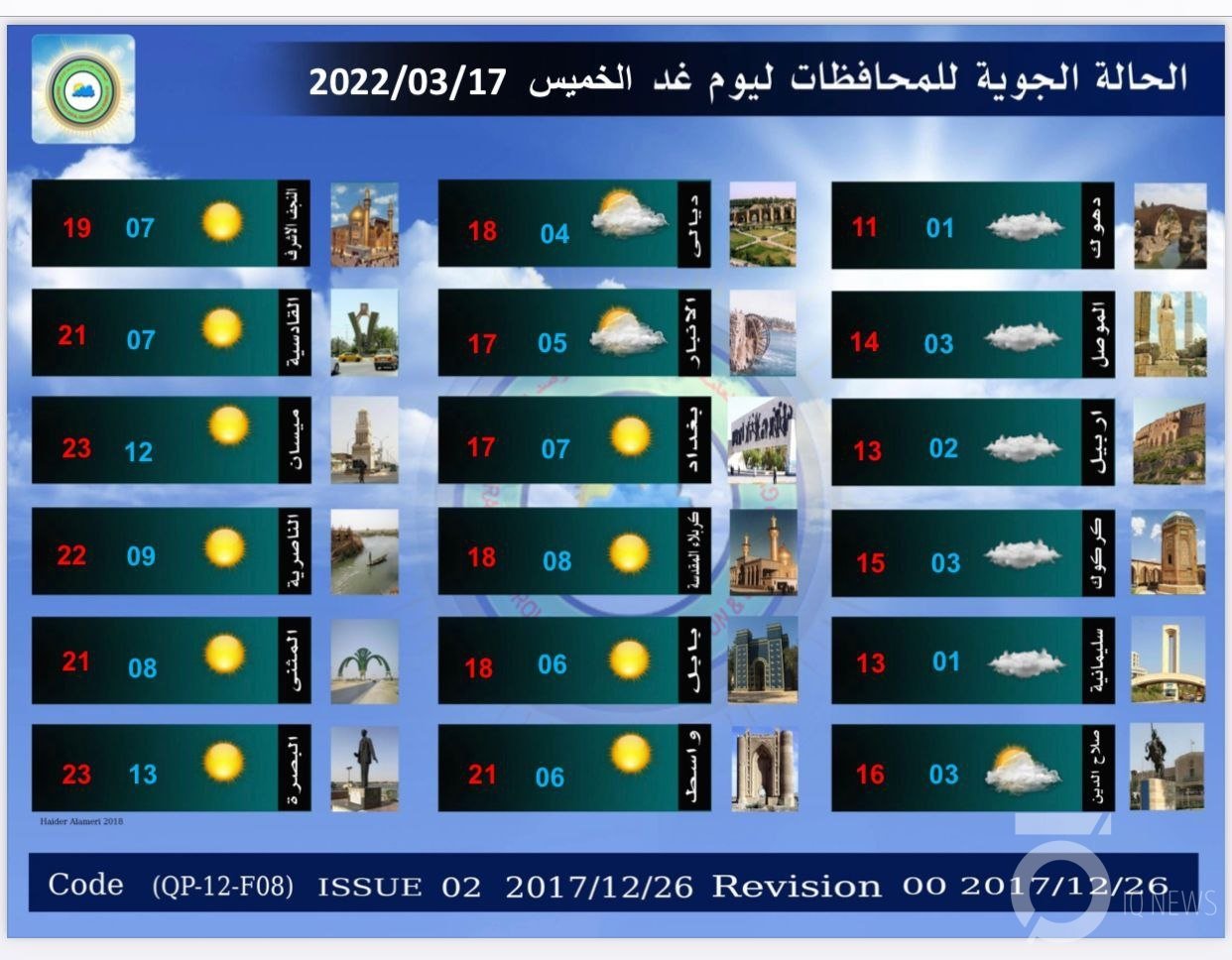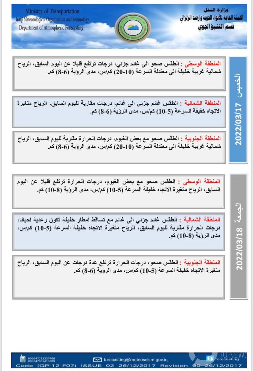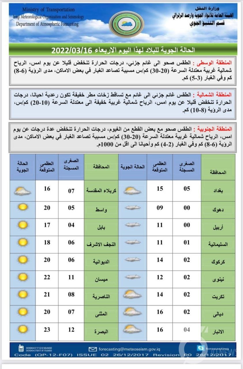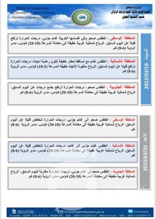 توقعت هيئة الأنواء الجوية، الأربعاء، (16 آذار 2022)، انخفاضاً بدرجات الحرارة عن يوم أمس، فيما توقعت ارتفاع درجات الحرارة بدءاً من الغد والأيام المقبلة.