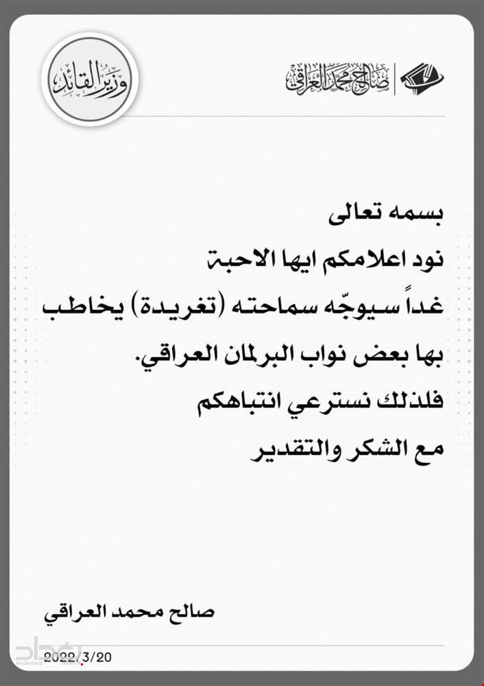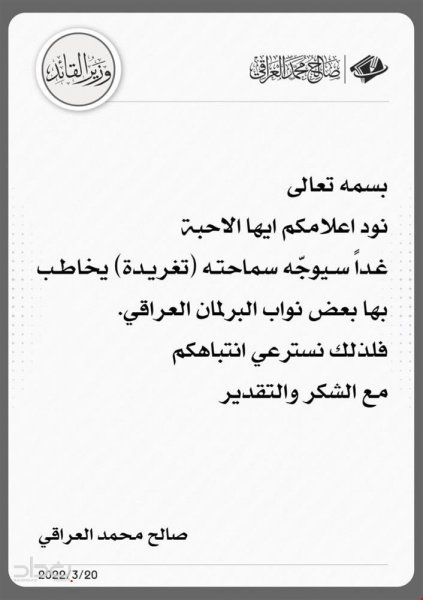 اعلن وزير زعيم التيار الصدري مقتدى الصدر، اليوم الاحد، بان الصدر سيخاطب نواب الكتلة الصدرية.وقال في تغريدة على تويتر: